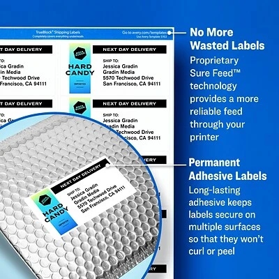 Create professional-looking packages quickly and easily with White Shipping Labels. These bright, white labels offer sharp, clear print and are perfect for shipping, mailing, organizing, crafts and other large labeling projects. They’re easy to customize with your logo and information, using the free templates and designs at avery.com/print. The labels are made from Forest Stewardship Council (FSC) certified paper and are compatible with both laser and inkjet printers. These labels also feature exclusive Avery Sure Feed technology to improve print alignment and avoid jamming.