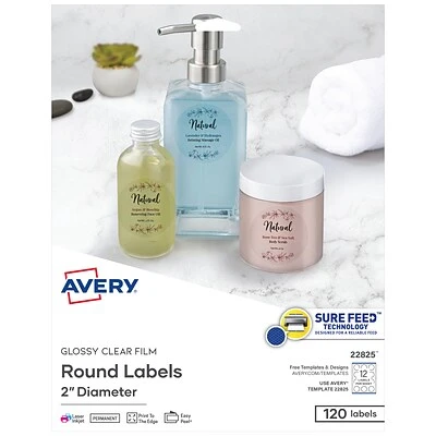 Give your product or handmade gift a custom printed on look with Avery crystal clear round labels, best when applied to white or light colored surfaces. Our print-to-the-edge capability allows you to create bright, eye-catching full-bleed labels with sharp text and crisp images printed right to the edge of the round sticker label with no border or margin. Each sheet of labels features Sure Feed technology which helps deliver a more reliable feed through your printer to prevent print misalignments and paper jams. Our round printable stickers are quick and easy to apply with our patented Easy Peel label sheets with Pop-up Edge. Simply fold the sheet back to display the label edges for convenient and fast peeling that saves time and avoids label waste. A strong permanent adhesive is used to make sure that these labels stick and stay to paper, cardboard, plastic, glass, metal and more, without curling or falling off. Compatible with both laser and inkjet printers. Avery Design & Print makes it easy to create customized labels from your own home or business. The free browser-based software has everything you need to design product labels, gift labels, thank you stickers and packaging labels for candles, soap, cosmetics and more. Try it out today at avery.com/templates. Try it out today at avery.com/templates. Try it out today at avery.com/templates.