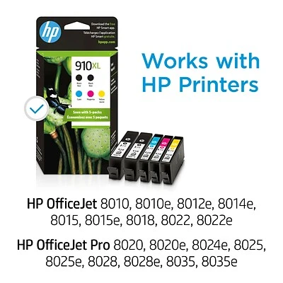 Original HP ink cartridges provide precision output page after page, free and easy recycling, meet stringent eco-label emissions criteria for indoor air quality, and are designed for security you can trust. Keep your home or office running smoothly with Original HP 910 ink cartridges.